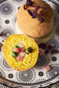 đź§€ Arancino allo zafferano con prosciutto cotto Premium, piselli e formaggio filante.