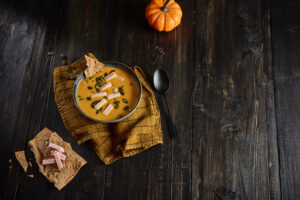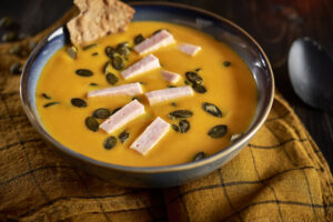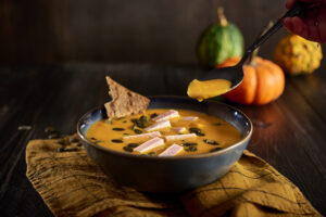 7. Comporre il piatto: versare la vellutata ben calda nelle fondine, distribuire sopra le striscioline di tacchino, completare con i semi di zucca tostati e un filo d’olio a crudo.